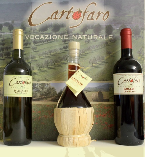 Attualmente la produzione di vino biologico Cartofaro riguarda i D.O.C. Rosso Piceno e Falerio oltre agli I.G.T. Marche Sangiovese e Marche Trebbiano. L’uva viene vendemmiata a mano e la vinificazione avviene presso la cooperativa dei “Colli Venarottesi”, anch’essa con certificazione biologica. Una parte della produzione viene utilizzata per fare il “vino cotto; prodotto tradizionale che si realizza facendo ridurre il mostro fresco a fuoco diretto su caldaia di rame finche’ non raggiunge i 26 gradi di concentrazione di zucchero. In seguito si lascia fermentare con aggiunta di mosto fresco e si invecchia per due anni in barriques.